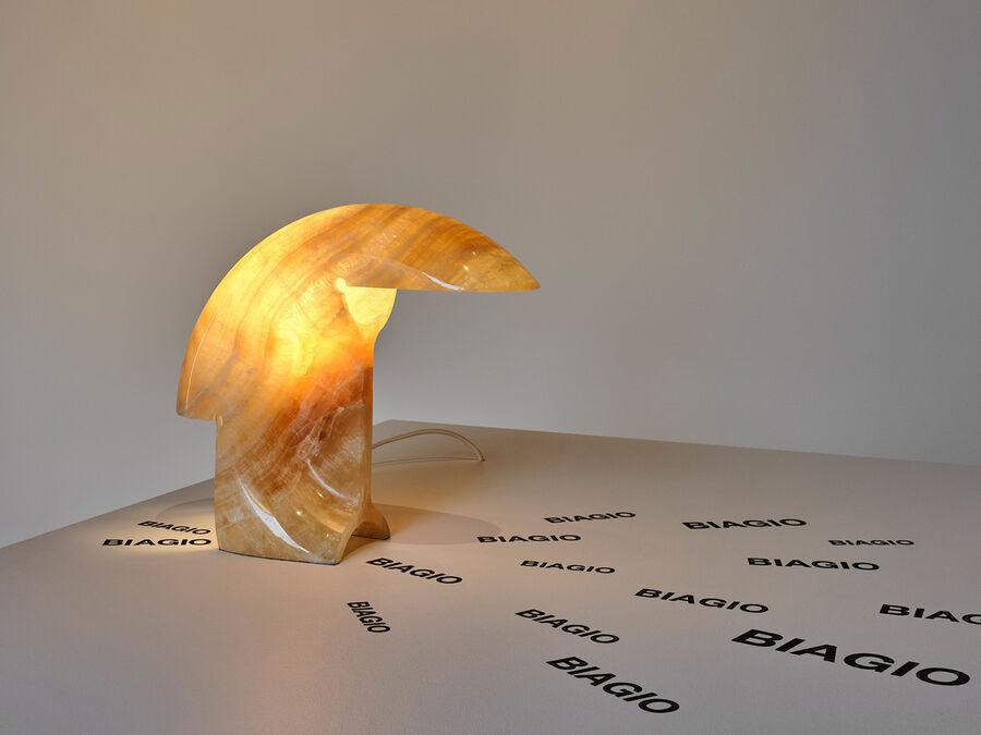 Criada pelo designer Tobia Scarpa, esta luminária de mesa é esculpida em um único bloco de Onix e proporciona luz direta.